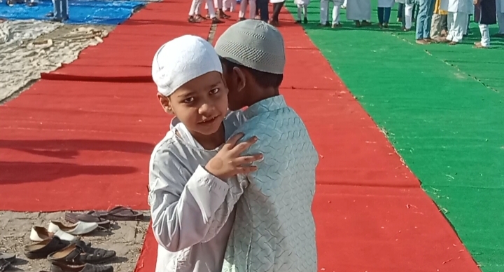 बच्चे गले मिलकर एक दूसरे को दी बधाई