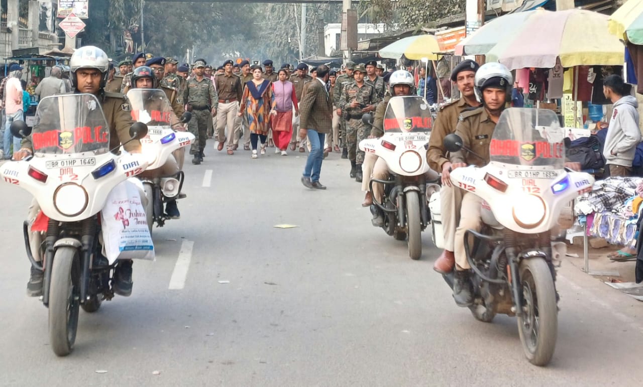 जमुई. सरस्वती पूजा एवं शव-ए- बारात पर्व को शांतिपूर्ण माहौल में संपन्न कराने को लेकर जिलाधिकारी अभिलाष शर्मा तथा पुलिस अधीक्षक मदन कुमार आनंद के नेतृत्व में मंगलवार को शहर में फ्लैग मार्च निकाला गया फ्लैग मार्च शहर के श्री कृष्णा स्टेडियम से निकलकर कचहरी रोड महाराजगंज बाजार थाना चौक खैर मोड बोधवन तालाब महिसौड़ी चौक बायपास रोड होते हुए पुनः स्टेडियम पहुंच।